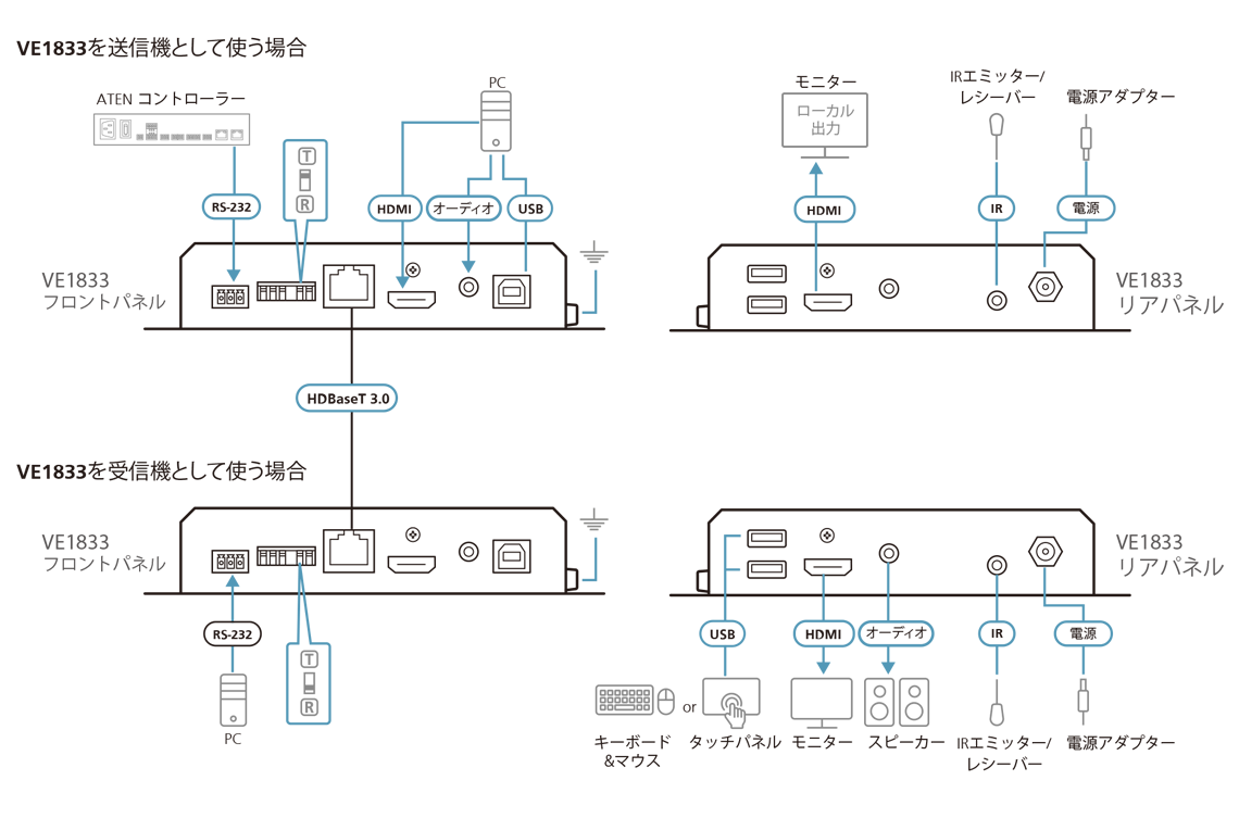 | VE1833 | 送信/受信 兼用:[HDBaseT 3.0 Lite 準拠] [CAT6a:40m (4K) / 70m (1080P)] [HDMI (4K@60Hz)] [USB2.0:2ポート] [ステレオ出力 (エンベデッド/ディエンベデッド)] [RS232/双方向IR 延長] [ローカルビデオ出力] [双方向PoH] | お問合せ |