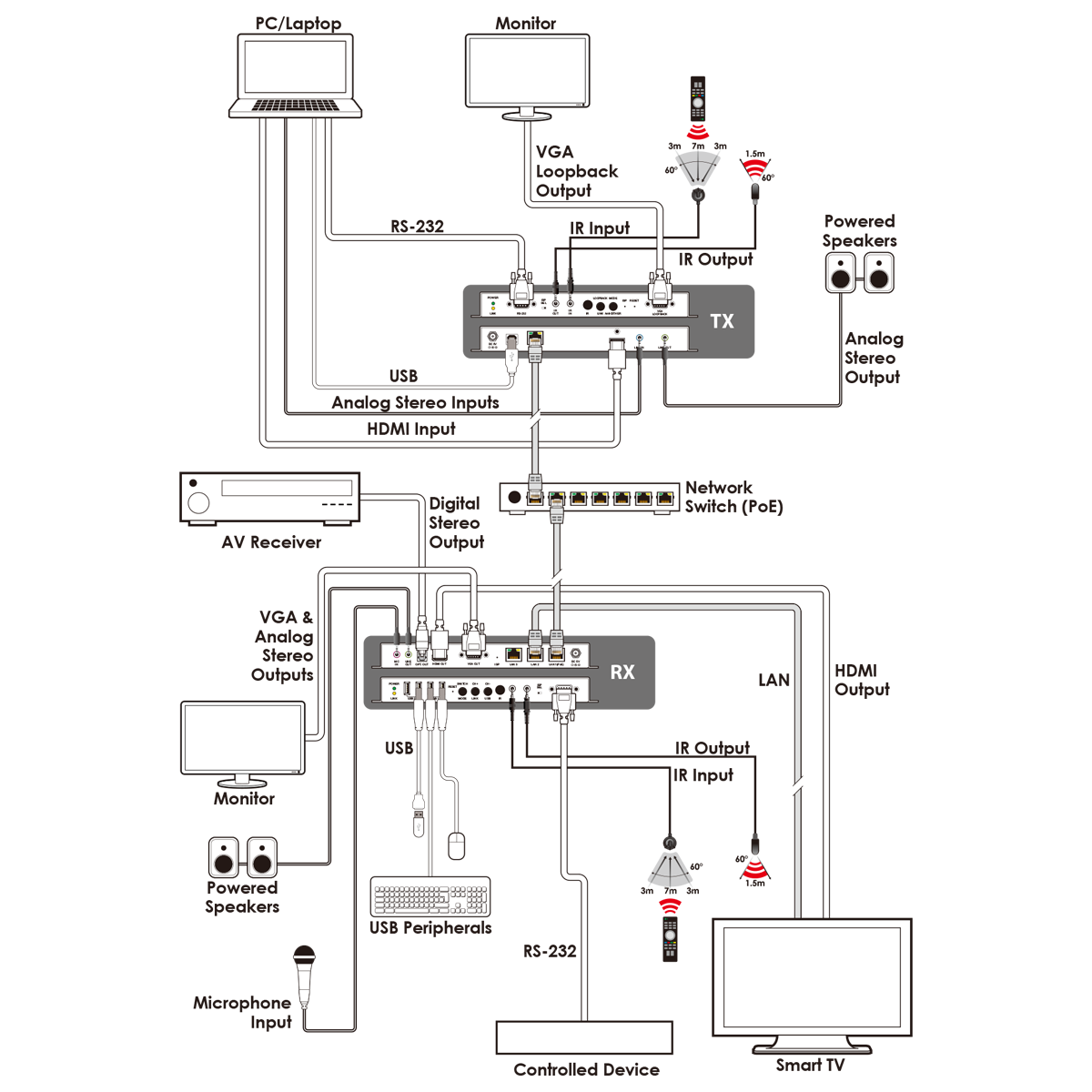 送信器:[CAT5e/6:100m / 1GbEスイッチングハブ経由] [入力:HDMI (4K@30Hz)] [VGAループバック出力] [USBホスト] [ステレオ入出力/RS-232/双方向IR 延長] [ビデオウォール] [制御:Web GUI/Telnet/IP Master Controller] [PoE受電 (802.3af)] | お問合せ |