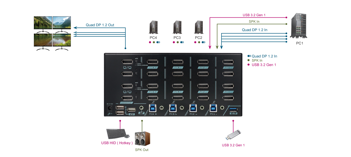 | タイプ | 4K@60Hz クアッドディスプレイ DisplayPort + 5Gbps USB 3.2 KVM切替器 |